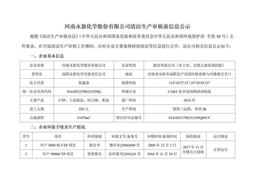 河南永新化學(xué)股份有限公司清潔生產(chǎn)審核前信息公示